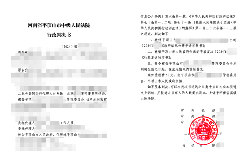 河南省平顶山市中级人民法院经审理,完全采纳了付兆敏律师的意见。法院认为,在被告已明知其指引的机关回复“信息不存在”的前提下,仍作出让原告前往获取的告知,缺乏事实依据。同时,依据相关法律规定,原告申请公开的“房屋征收决定及补偿安置方案”等信息,依法应由县级以上地方人民政府制作或保存,被告某管委会的答复适用法律错误。据此,法院作出一审判决: