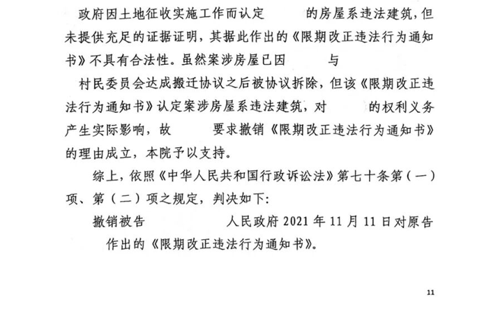 在王维雪律师的帮助下,牛先生准备好充分的证据,对镇政府提起了行政诉讼。在庭审过程中,律师对镇政府出具的核实材料的真实性提出质疑:调查笔录、情况说明缺少本人签名,村委会的情况说明也仅有村委会盖章、缺少负责人或者经办人签名,这些材料的真实性无法核实。且镇政府的限期拆除通知根本没有履行相应的通知程序。房屋被一纸令下直接拆除,牛先生一家无从获得应有的安置保障。镇政府对此毫无辩驳之力,也无法解释怎么做到在一天之内就核实了相关情况,确认了房屋违建。这样的行政行为未免让当事人难以信服,法官更无法认定确认违建结果的合法性。