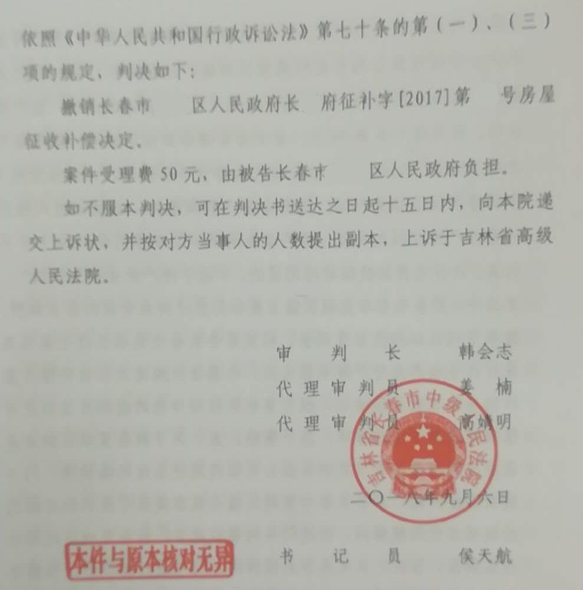 长春市中级人民法院经审理,采纳了律师的代理意见,认为被告区政府作出的《房屋征收补偿决定》证据不足、程序不当。法院最终判决: