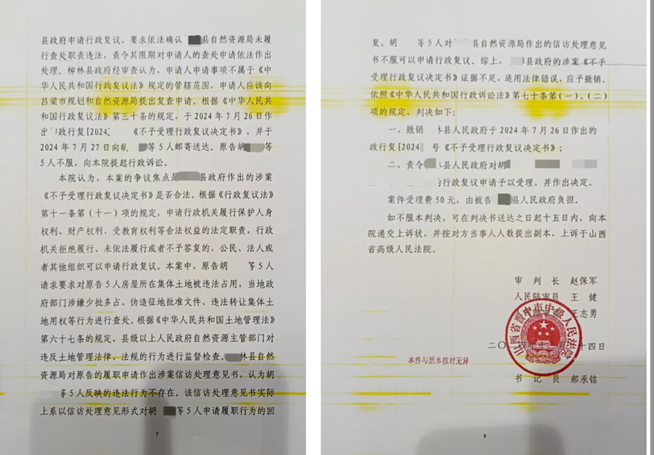 某县自然资源局作出回复称委托人的宅基地不在征地批复范围,不存在少批多占等违法行为,显然与事实不符。本案,在收到查处申请后,未依法立案调查,而作为信访事项处理,属于不履行查处职责。章然律师整理行政复议材料,向某县政府申请行政复议。然而,某县政府不依法审查,直接作出《不予受理行政复议申请决定书》。章然律师指导委托人向吕梁市中级人民法院提起行政诉讼。庭审中,章然律师陈述列明当地政府存在的违法行为以及某县自然资源局具有查处违法占地行为的法定职责却没有履行职责;某县政府作为行政复议机关应当依法受理,并作出行政复议决定,其不予受理行政复议申请决定,事实认定不清,适用法律错误。