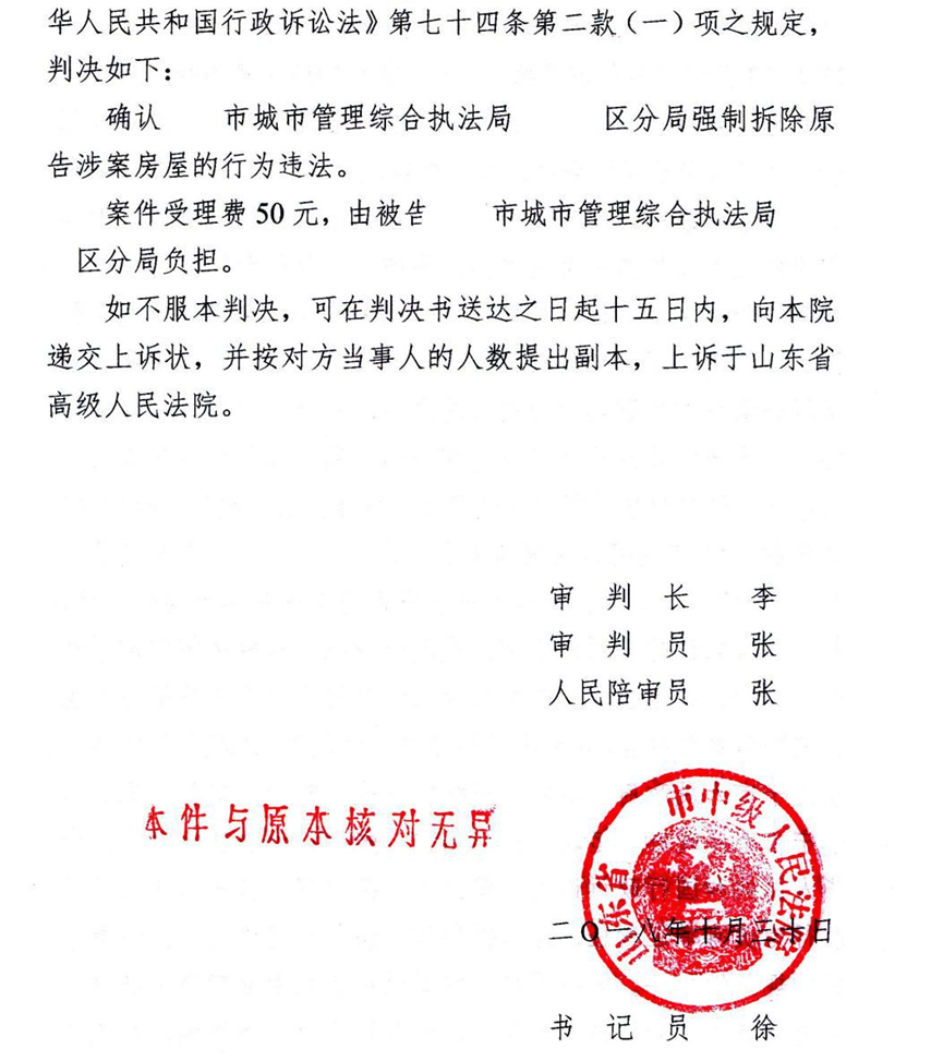 山东省某市中级人民法院判决:确认区执法局强制拆除吴先生房屋的行为违法。