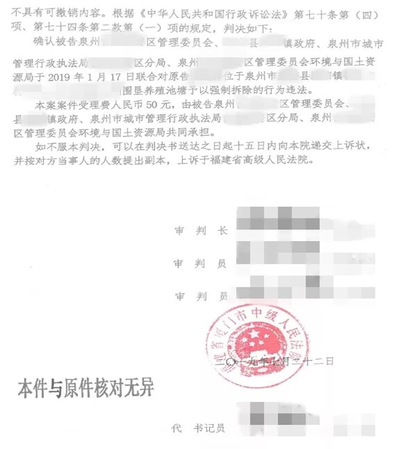 福建省泉州拆迁案例:四部门联合强拆二十余年养殖场,法院确认行为违法!