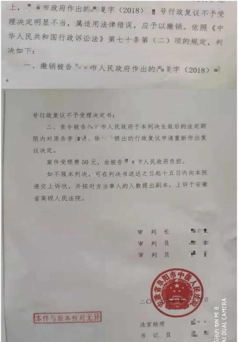 王维雪律师团队研究案情后,立即作出了应对方案,指导李女士和徐先生以邮寄的方式向某市政府申请行政复议,请求确认某街道办在李女士和徐先生门前垒墙封门的行为违法并责令其立即拆除。李女士和徐先生于2018年12月26日收到某市政府作出的行政复议不予受理决定书,王维雪律师遂指导李女士和徐先生向法院提起行政诉讼,请求依法撤销某市政府作出的行政复议不予受理决定,并判令其依法受理李女士和徐先生提出的行政复议申请。